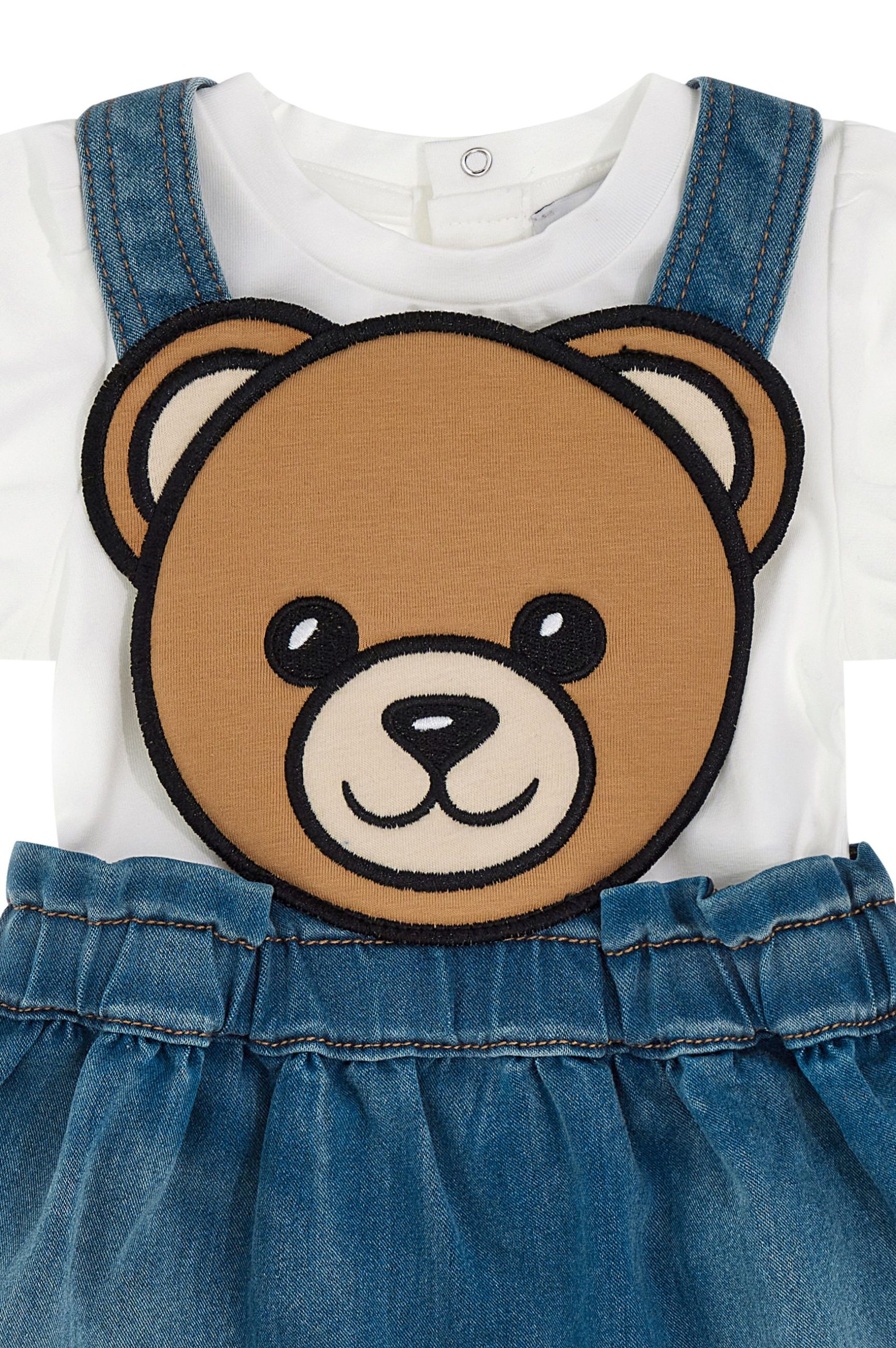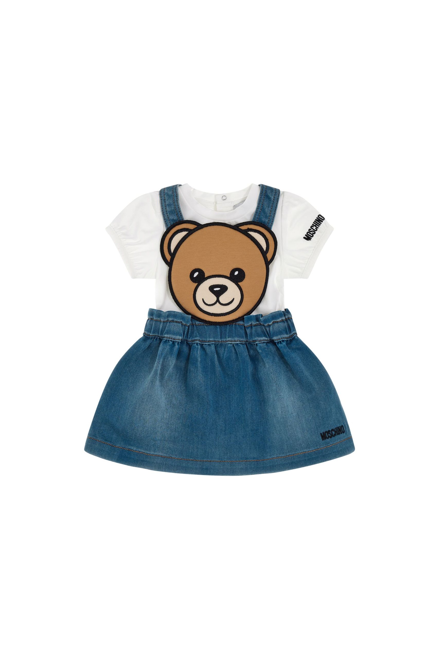 Salopette in jeans gonna e maglia mezza manica Neonata – Moschino